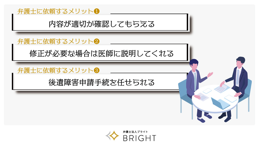 弁護士に依頼すれば、後遺障害診断書の内容に問題がないかを確認してもらえます。記入漏れがないか、必要な検査結果が記入されているかなどを専門家の目でチェックします。認定のために理想的な内容かを確認してもらえるので安心です。