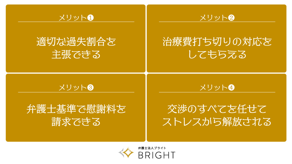弁護士基準での賠償金請求が出来るようになるため、弁護士費用を差し引いても受け取れる金額が大きくなる可能性があります。