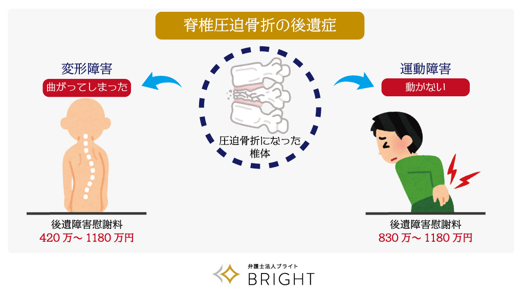 交通事故で脊椎圧迫骨折などを負った場合、神経症状、運動障害、変形障害、荷重機能障害などの後遺症が残る可能性があります。