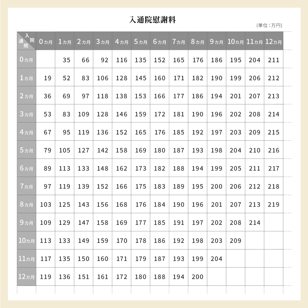 なお、ここで紹介している慰謝料はあくまで目安です。実際には症状や治療内容、通院頻度などの個別の事情をふまえて損害額が計上されます。